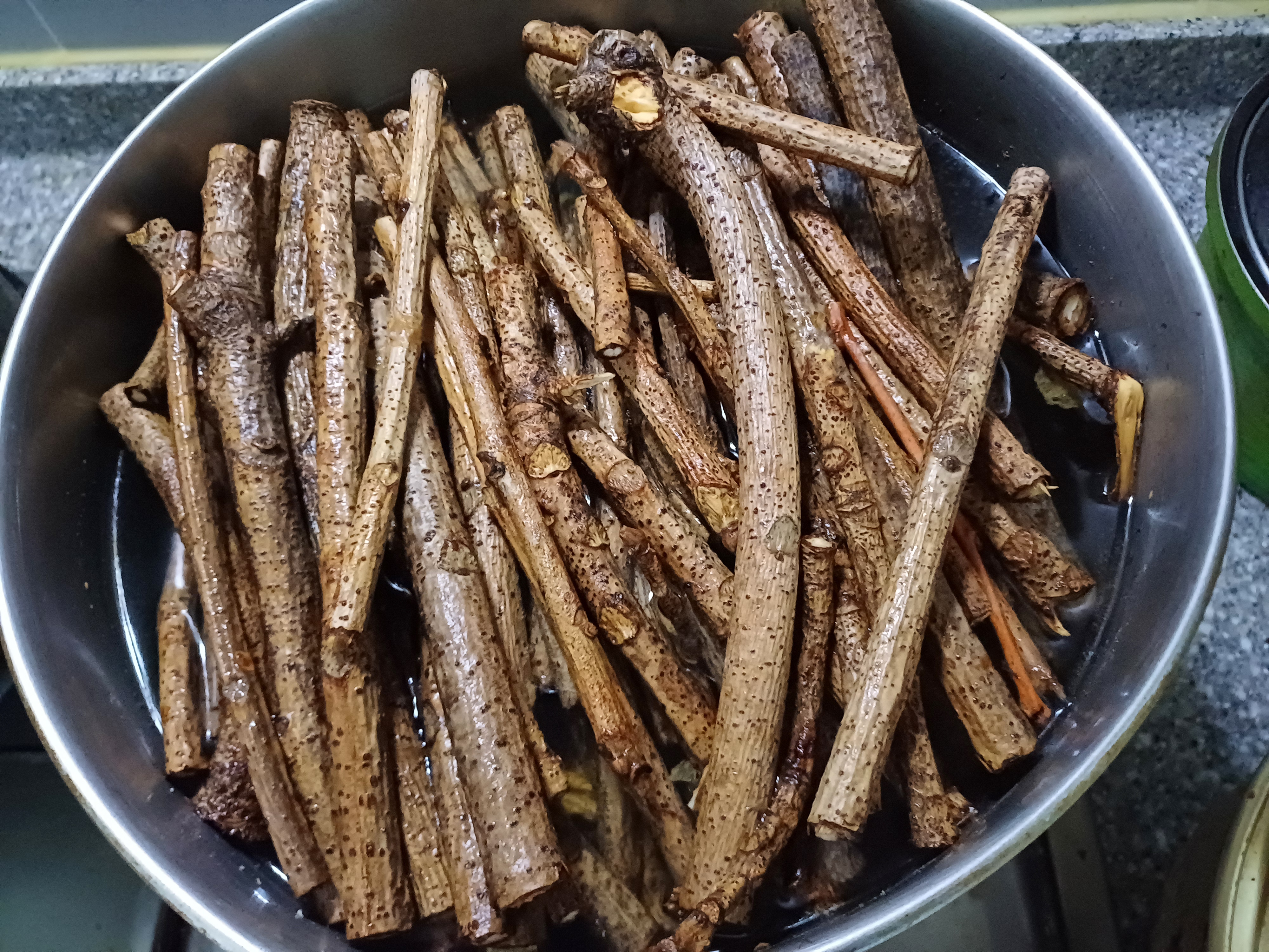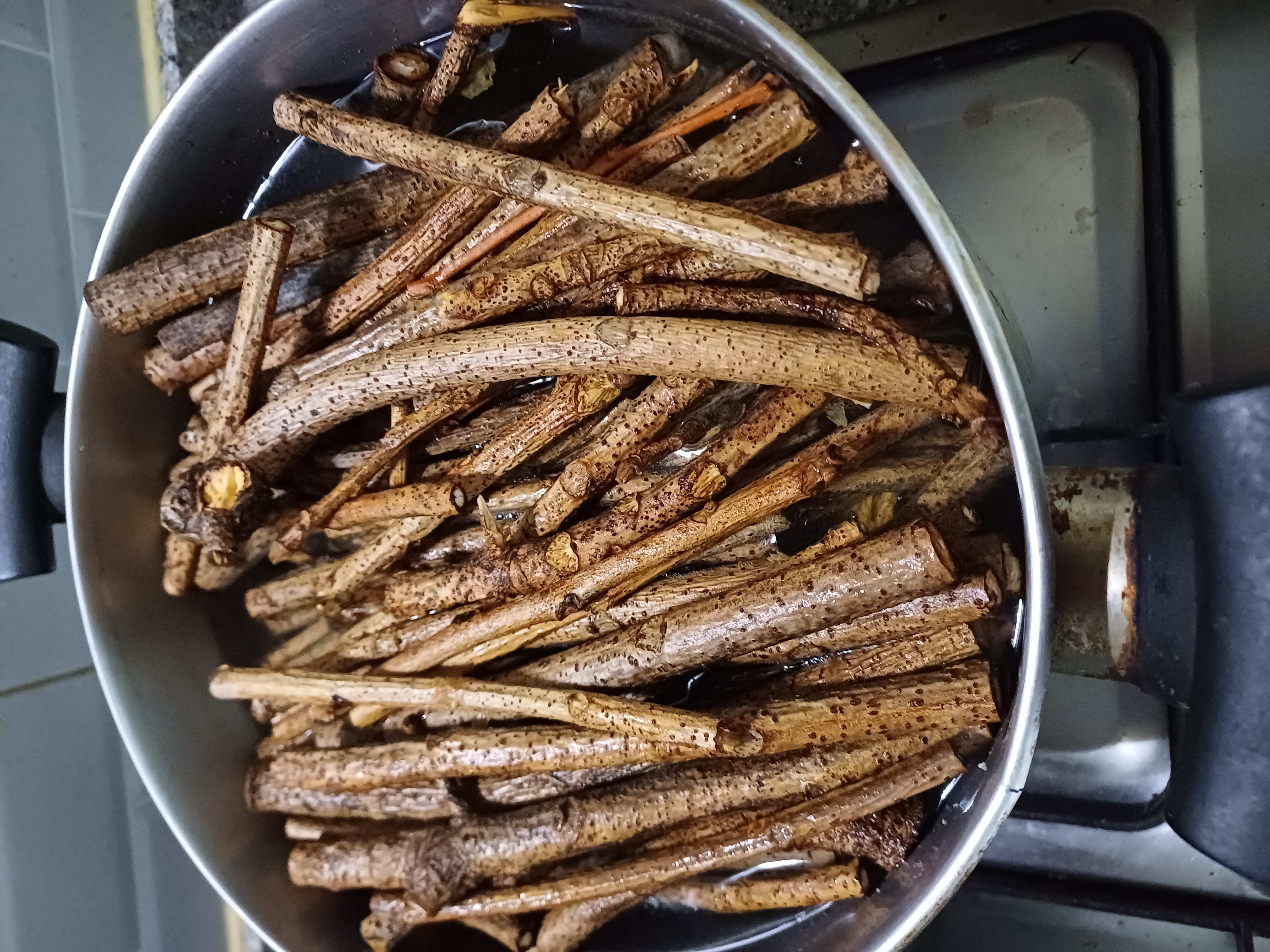 마른 옻나무를 4시간 정도 푹 삶았습니다.